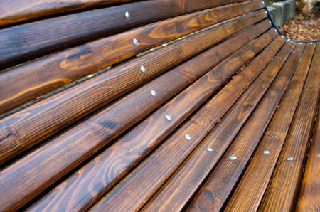 Angled view of a park bench with natural wood texture close up, shallow focus for use as autumn background.