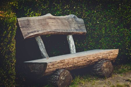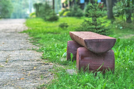 a log bench in the Park against a background of green grass. Natural light