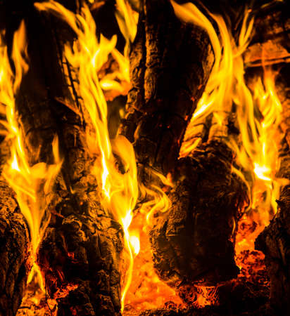 Fire. brightly burning firewood in a bonfire close-up