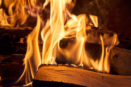 Yellow tongues of flame are dancing on wooden logs