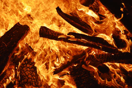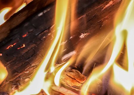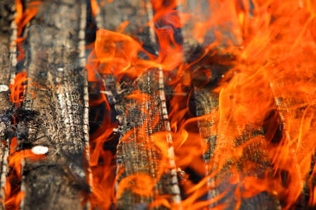 Abstract background, bright flame of fire, burnt pieces of wood.