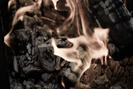 Burning firewood in the fireplace close up, BBQ fire, charcoal background