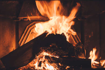 Burning firewood in a fireplace, close-up of flames