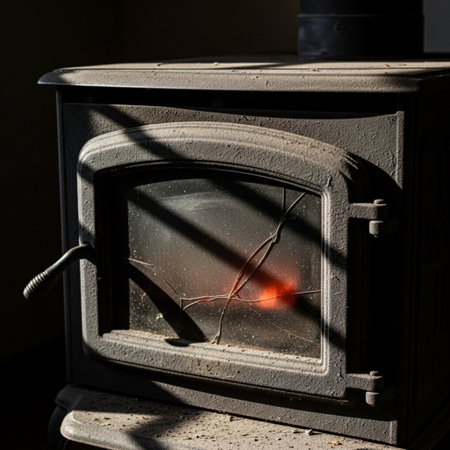 Cast-iron wood stove captured with a Dutch angle, showing dust, scratches, and a faint interior glow