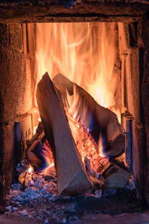 Burning wood in the fireplace and the flames