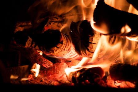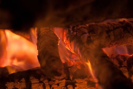 Fireplace with burning wood in the night. Selective focus.