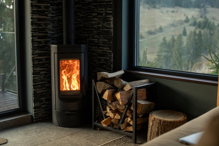 Modern black fireplace with burning fire and firewood on metal stand on background of big windows with view on mountains. Cozy warm and calm moments at cold season.