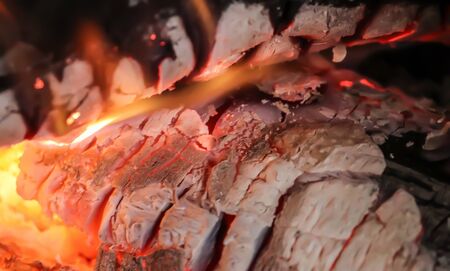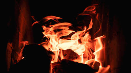 Bright colored dancing flames in fireplace. Close up of burning firewood. Cozy warm background