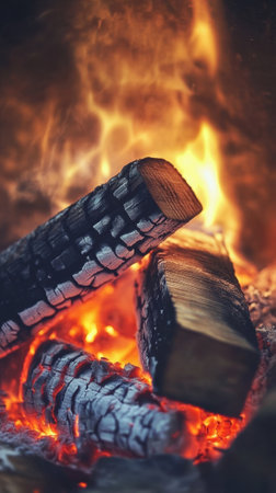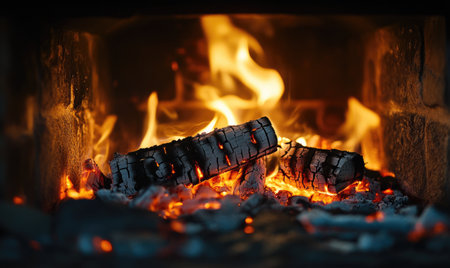 A close-up of a cozy fireplace showcasing burning logs and glowing embers, creating a warm and inviting ambiance perfect for winter and comfort-themed visuals.