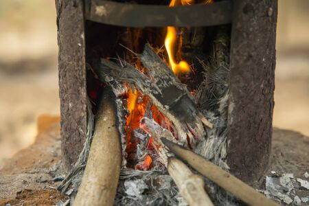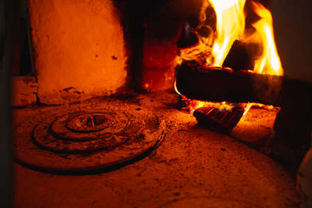 old rural oven with fire flame inside