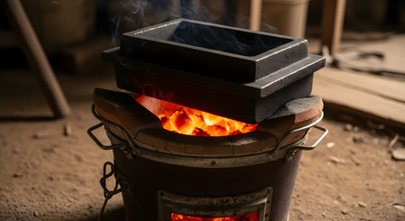 A traditional Asian clay stove, or brazier, is filled with glowing hot charcoal, providing intense heat. A black metal container or mold sits on top, with smoke rising, suggesting a process of cooking, melting, or traditional crafting.