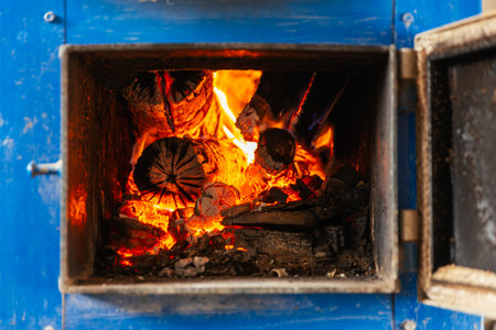 burning logs inside the solid fuel boiler with the door open, close-up