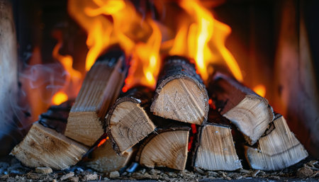 A stack of logs is positioned in front of a roaring fire, emitting heat and light. The logs are slowly burning, creating flames and crackling sounds. The firewood is providing warmth and ambiance in a cozy setting.