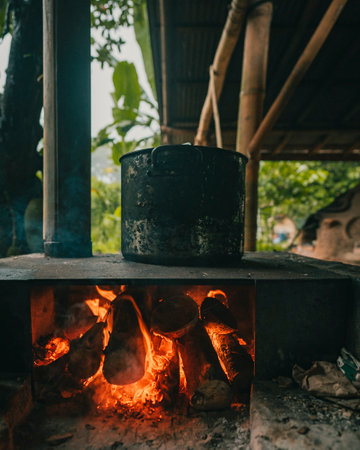A traditional cooking scene featuring a rustic stove with smoke rising, surrounded by fresh vegetables. This image captures the essence of outdoor cooking in a natural setting.