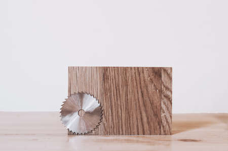 Close-up blade circular saw and joinery clamps on the background of the wooden table. Workshop for the production of wooden products. Joiners cutting tool