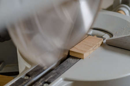 Circular saw cutting wooden plank. Blade with board close-up. Woodworking detail with wood. Working equipment carpentry workshop.