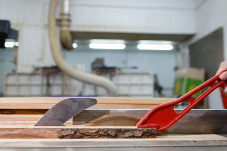 Carpenter working with Industrial tool in wood factory, circular blade with a wood board