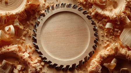 Light brown wooden disc, possibly a circular saw blade, with a metal saw teeth edge, is prominently displayed amidst scattered wood shavings. The image's focus is on the contrast between the smooth wooden disc and the rough texture of the wood shavings.