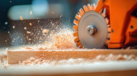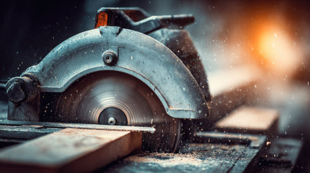 A close-up view of a circular saw blade cutting through wooden lumber, showcasing fine details of a workshop environment with warm lighting and wood shavings. Perfect for DIY and carpentry themes.