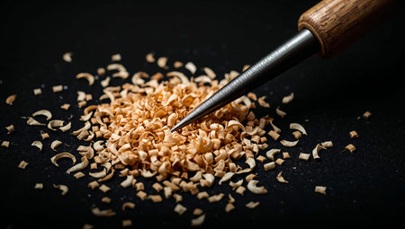 A detailed close-up of a woodworking tool cutting through timber, revealing intricate grain patterns and fine shavings amid a sunlit workshop environment.