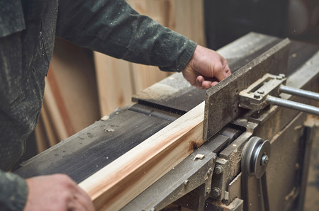 Woodworking machine plane process a wooden plank. Workers hand hold a wooden plank. Manual wood processing concept.