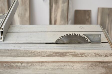Carpentry machine electronic table saw, sharp cut metal steel silver, retro concept