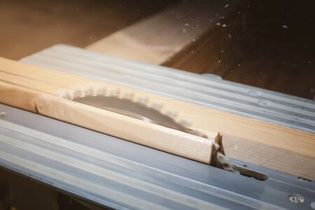 board is on the circular saw machine in the workshop of woodworking.