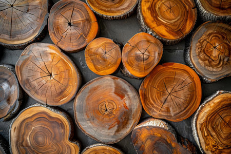 The image is a collage of wood pieces, with some of them being cut in half. The wood pieces are arranged in a way that creates a sense of depth and texture. Scene is rustic and natural