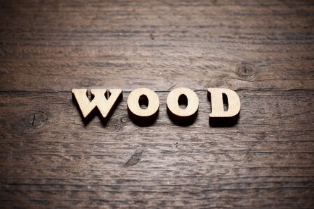 Wood word on a wood table.