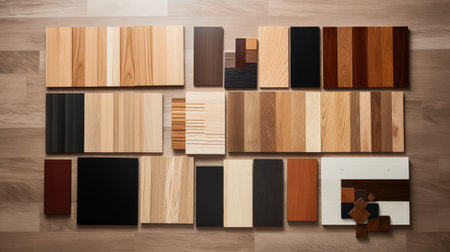 An assortment of wooden planks, showcasing a variety of colors and grain patterns. The composition features both horizontal and vertical arrangements, highlighting the natural textures and tones. This image might be suitable for design projects, product presentations, or creating visual backgrounds for different applications, without focusing on specific brands.