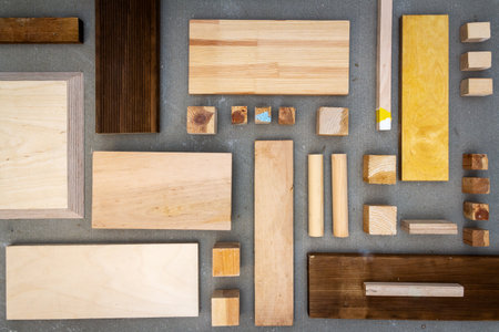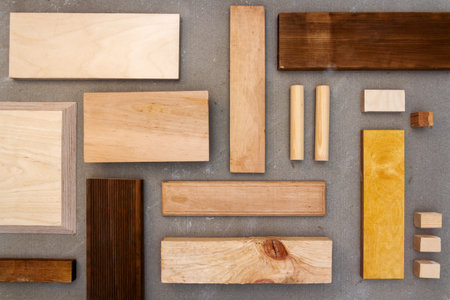 Flat lay of various wood and plywood pieces on concrete texture. Carpentry background.