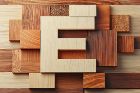 The image is a creative and artistic representation of the letter E made out of wooden blocks. The blocks are arranged in a way that forms the shape of the letter