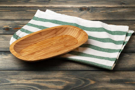 The brown wooden plate on a rustic table closeup. horizontal top view.