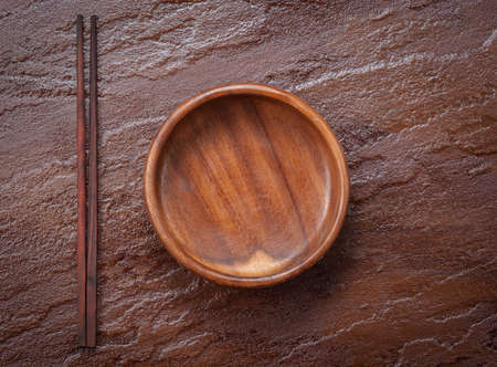 Overhead view of various design empty plates and sushi chopsticks on old wooden table. View of dining setting in vintage mood with dramatic light.