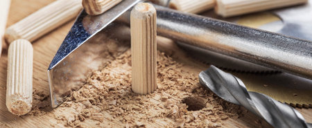 wood screws and dowels on wooden background