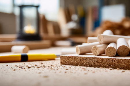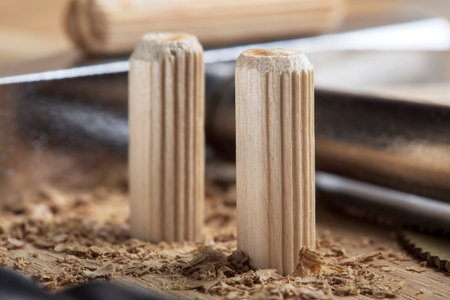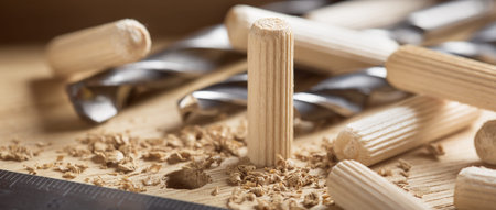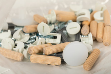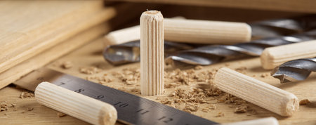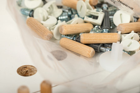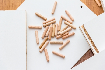 Wooden furniture pegs scattered on the surface of the chipboard. Furniture assembly at home