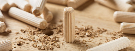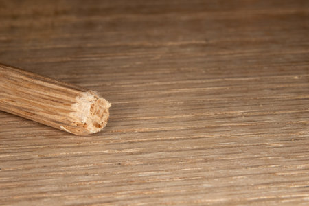 single oak dowel pins on oak background, dowel pins used to join two pieces of wood, joint, joinery