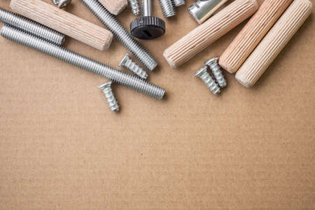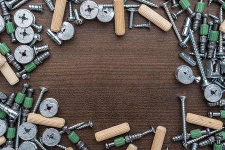 Elements of fastening pieces of furniture on a wooden background.