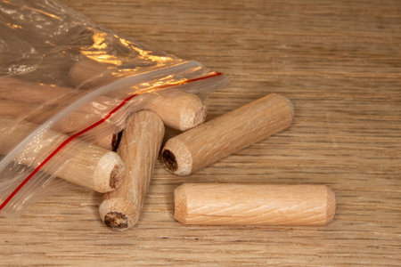 bag of oak dowel pins on oak background, dowel pins used to join two pieces of wood, joint, joinery