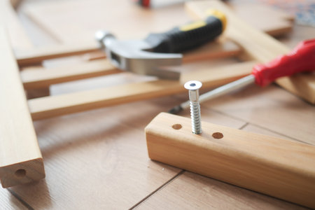 Close up picture of carpenter tools for furniture assembling at home