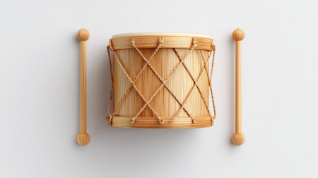 A wooden drum and twostick drums are placed on a white background highlighting the craftsmanship of the drum in a clean and simple setup.