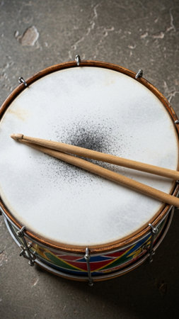 Close-up of a snare drum, percussion instrument on a dark background with beautiful lighting, copy space.