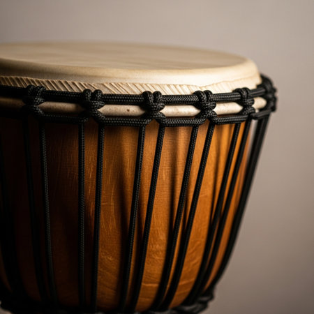 Close-up of a djembe of natural skin of African origin with its tightly fastened tension and tuning strings