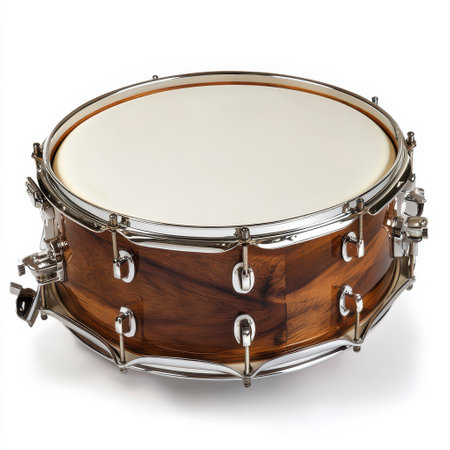 A classic wooden snare drum with metal hardware and a clear drumhead sits on a white background. Perfect for music lovers and creative projects.