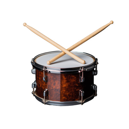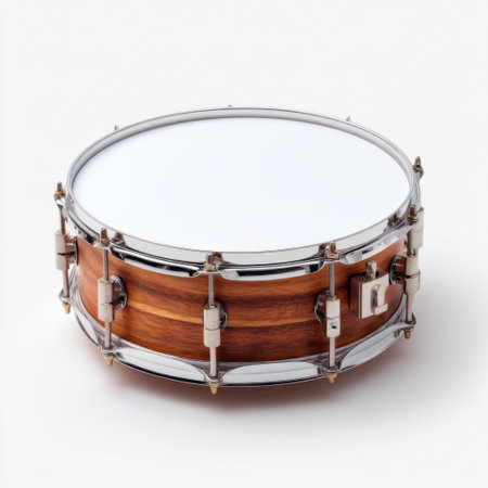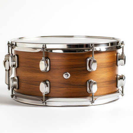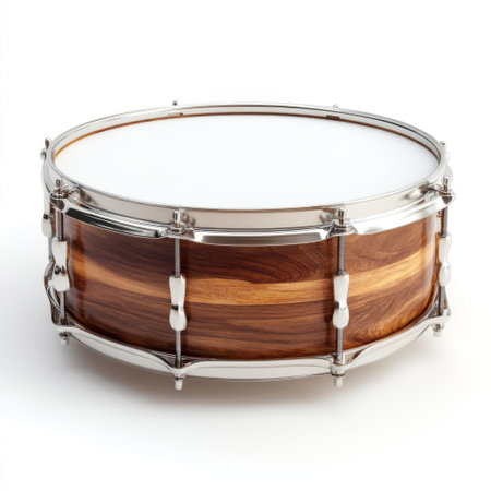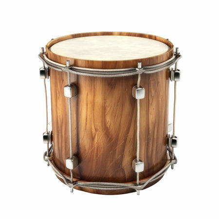 A wooden snare drum with metal hardware isolated on a white background, perfect for music-related projects.