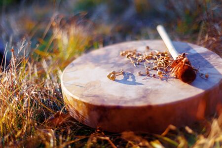 A shaman drum with intricate designs used in spiritual rituals to connect with the spirit world. Concept Spiritual Rituals, Shaman Drum, Intricate Designs, Connection with Spirit World