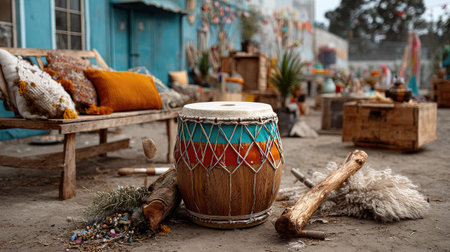 A vibrant outdoor market scene showcasing a colorful drum surrounded by rustic decor, expressive textiles, and artistic furniture elements, creating a lively atmosphere.