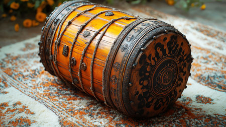 Close-up of a traditional Indian dholak drum resting on an intricately patterned carpet. The drum's detailed carvings and rope bindings reflect cultural craftsmanship.