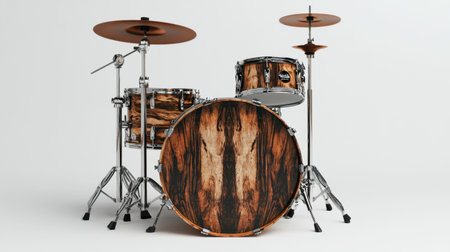 A captivating view of a wooden drum set featuring rich grain patterns, perfect for showcasing musical artistry in a modern and creative setting.