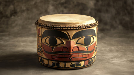 This image captures a beautifully crafted Native American drum, featuring detailed carvings and a natural finish, highlighting the rich cultural significance of the instrument.